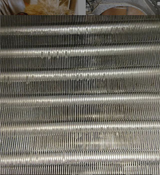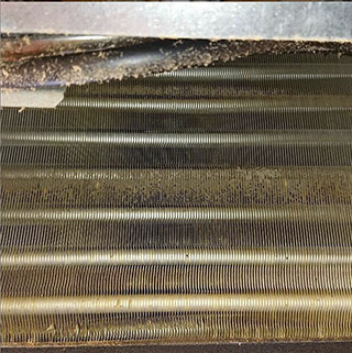【Before】熱交換器は冷媒が通り空気を冷やしたり、暖めたりします。夏場は湿気でカビが生えやすくなる部分でもあります。